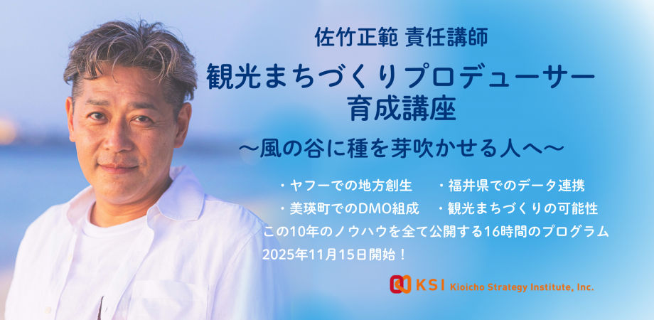 紀尾井町戦略研究所株式会社(本社:東京都港区、代表取締役 別所 直哉、以下 KSI)は、同社社員であり、ヤフーでの地方創生プロデューサー、北海道美瑛町でのDMO立ち上げ、そして福井県での国内最大級の観光データプラットフォーム「FTAS」による観光DX推進など、日本の観光とまちづくりの最前線を走り続ける佐竹正範氏による「観光まちづくりプロデューサー育成講座 ~風の谷に種を芽吹かせる人へ~」を2025年11月15日(土)より開始します。