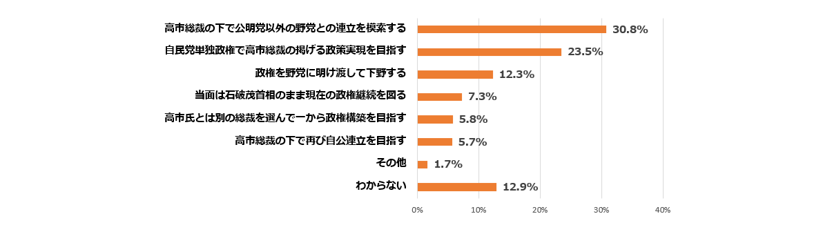 自民党は現在、衆院で196議席(定数465)で過半数(233)に届いておらず、予算案や法律案などを通すためには野党の協力が不可欠となっている。公明党の連立離脱表明を受けて、自民党はどうすべきだと思うか、自身の考えに最も近いものを一つ選んでもらうと、「高市総裁の下で公明党以外の野党との連立を模索する」30.8%が最も多く、以下は「自民党単独政権で高市総裁の掲げる政策実現を目指す」23.5%、「政権を野党に明け渡して下野する」12.3%、「当面は石破茂首相のまま現在の政権継続を図る」7.3%、「高市氏とは別の総裁を選んで一から政権構築を目指す」5.8%、「高市総裁の下で再び自公連立を目指す」5.7%などと続いた。「わからない」が12.9%。