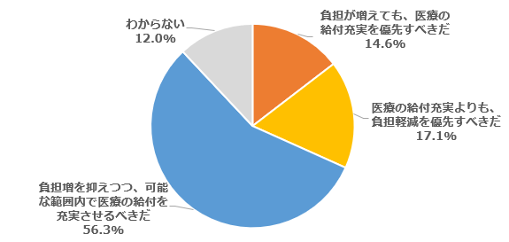 | Q5 診療報酬を引き上げる場合、医療従事者の待遇改善や地域医療の維持にプラスとなる半面、患者の窓口での自己負担や納める医療保険料などが増える可能性があります。医療の給付の充実と負担増の関係について、あなたはどう思いますか。あなたの考えに最も近いものを一つ選んでください。 |