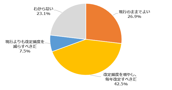 | Q4 診療報酬は、原則として2年に1回改定されていますが、インフレ局面では物価上昇や人件費の高騰を十分に反映できていないとして、毎年改定すべきだという指摘があります。診療報酬が引き上げられる(引き下げられる)場合、患者の窓口での自己負担や医療保険料などが増える(減る)可能性があります。あなたは、診療報酬の改定頻度について、どうすべきだと思いますか。 |