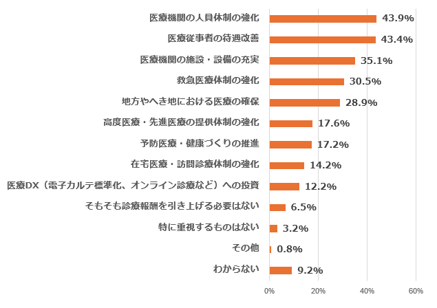 | Q8 診療報酬の引き上げにより追加的な財源が確保された場合、その配分先として、あなたが重視するものは何ですか。(複数回答可) |