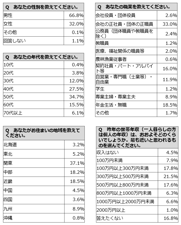 18歳以上の回答者1,000人の属性 --- 性別、年代別、地域別、職業別、年収別