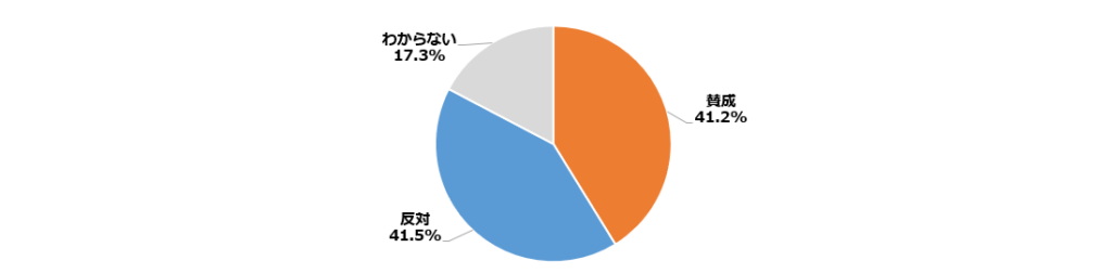 「賛成」とした人を男女別に見ると、男性は4割台半ばだったのに対し、女性は3割台半ばだった。職業別では、公務員(団体職員や教職員を除く)が5割だったのに対し、専業主婦・専業主夫が2割台で最低。支持政党別では参政と保守が6割台でトップとなり、自民党、維新などが5割台で続いた。これに対し、れいわとみらいは1割台で最低となり、次いで立憲民主党、公明、共産が2割台と少なかった。