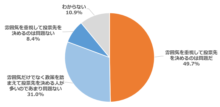| Q9 衆院選について、政策に関する議論が十分に深まらず、政党や党首、候補者の雰囲気・イメージが重視される「推し活選挙」になっているとの指摘があります。あなたは、雰囲気・イメージを重視して投票先を決めることについてどう思いますか。あなたの考えに最も近いものを1つ選んでください。 |