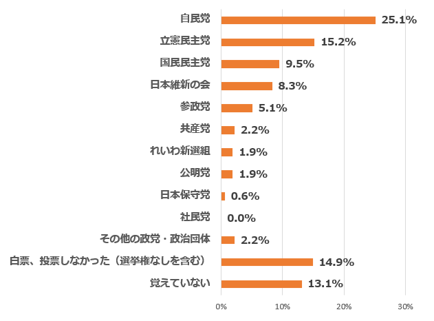 | Q14 【2024年10月に行われた前回の衆院選に関する質問です】2024年の衆院選の小選挙区で、あなたはどの政党の候補者に投票しましたか。 |