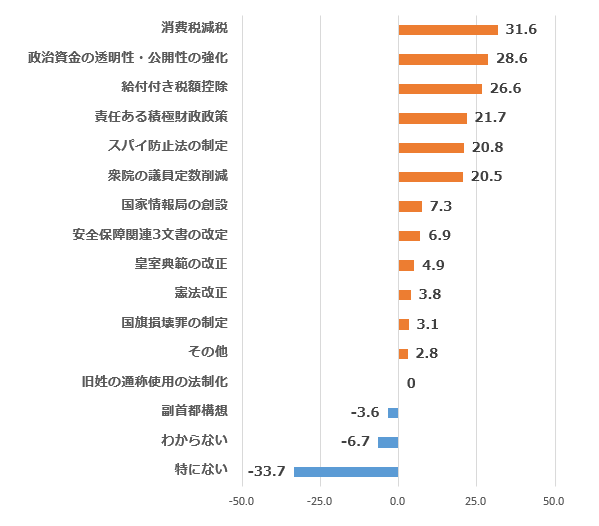 | (参考)Q3「自民に進めてほしい政策」とQ6「中道に反対してほしい政策」の差(ネットスコア) |