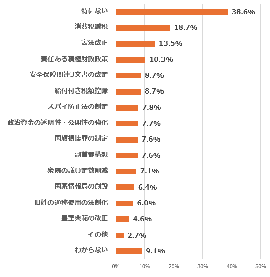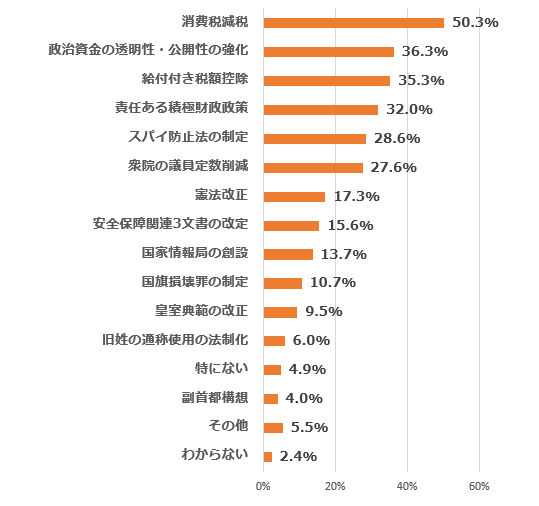 [オンライン調査] 推進望む⾼市カラー・公約政策は消費税減税、政治資⾦改⾰、給付付き税額控除(紀尾井町戦略研究所)