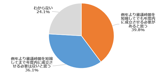 | Q10 2026年度予算案の国会審議入りは、衆院解散・総選挙を行った影響で、例年より約1カ月遅れています。このため、例年どおりの審議時間を確保した場合、予算案の年度内成立は困難との見方があります。一方で、高市首相は年度内成立を目指すとし、与党は野党に協力を求めています。報道によれば、与党内では審議時間の短縮も検討されています。あなたは、例年より審議時間を短縮してでも26年度予算案を年度内に成立させる必要があると思いますか、思いませんか。 |