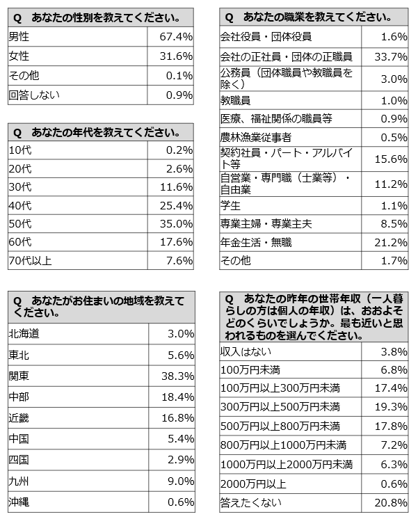 18歳以上の回答者1,000人の属性 --- 性別、年代別、地域別、職業別、年収別